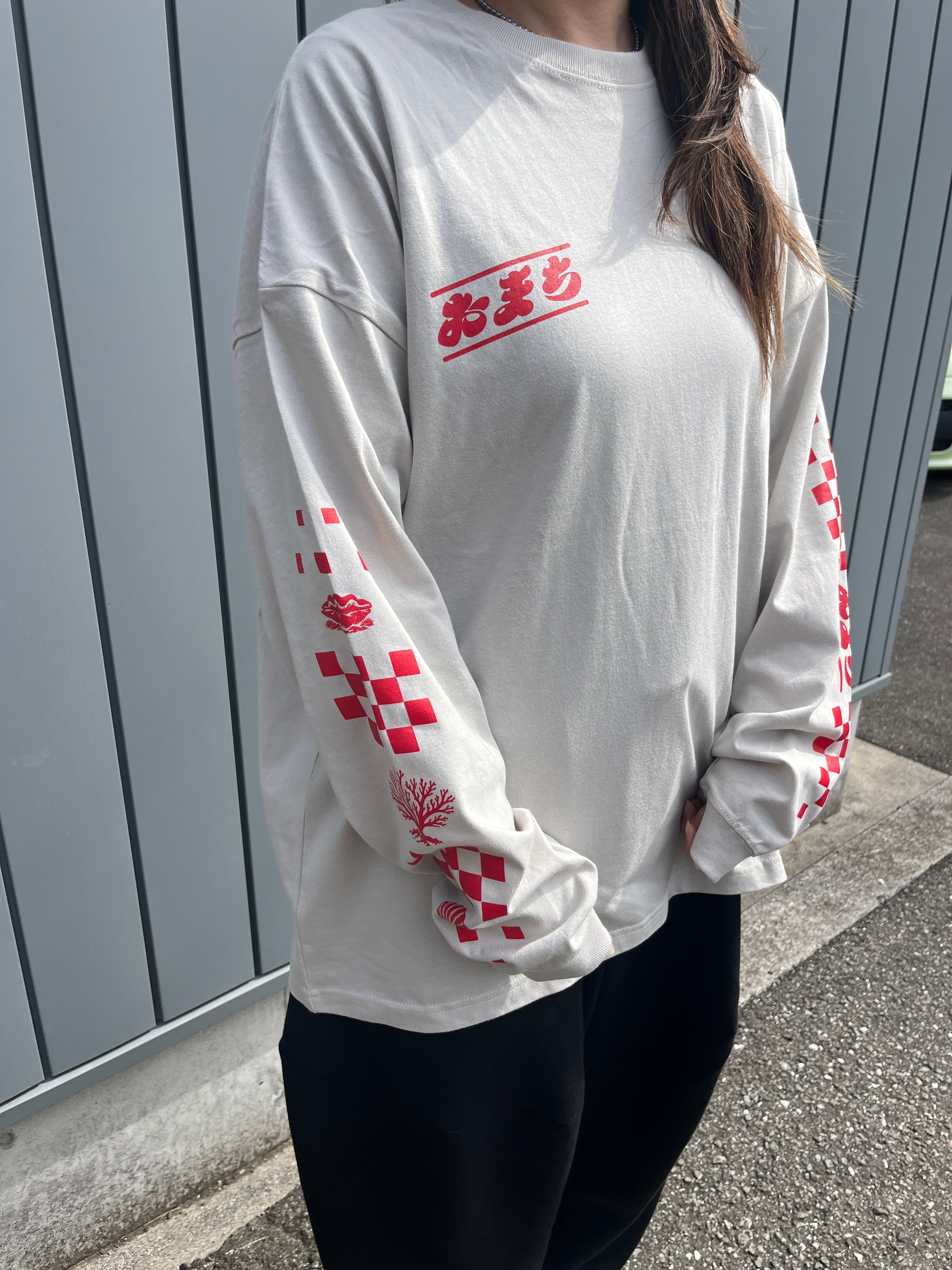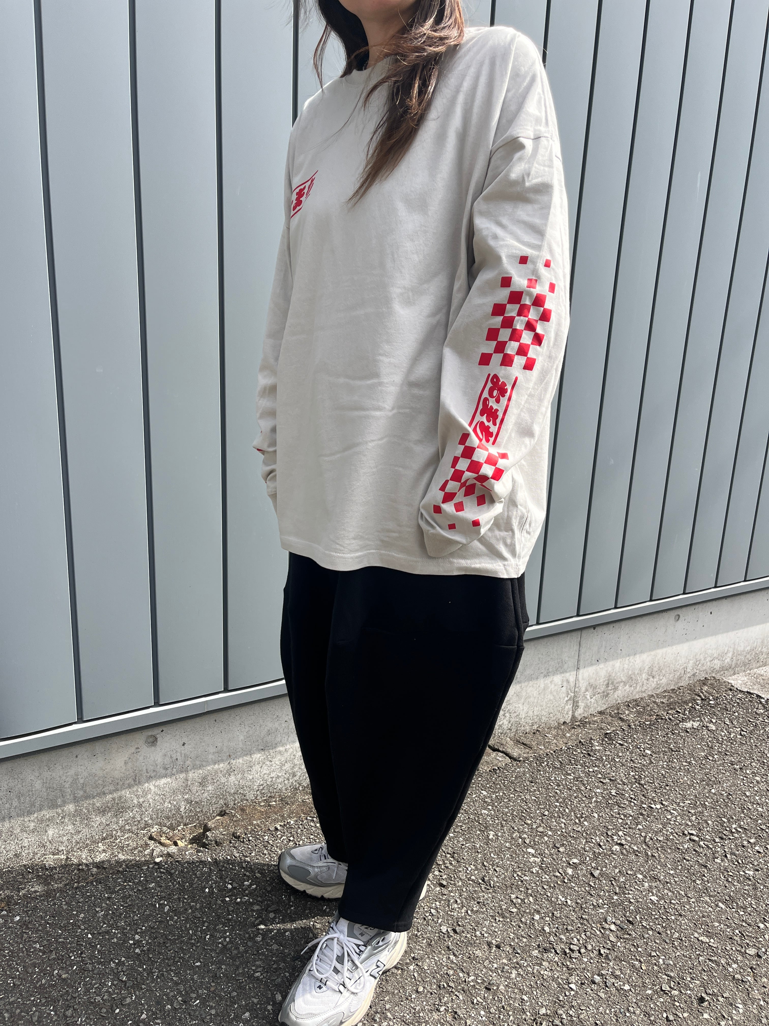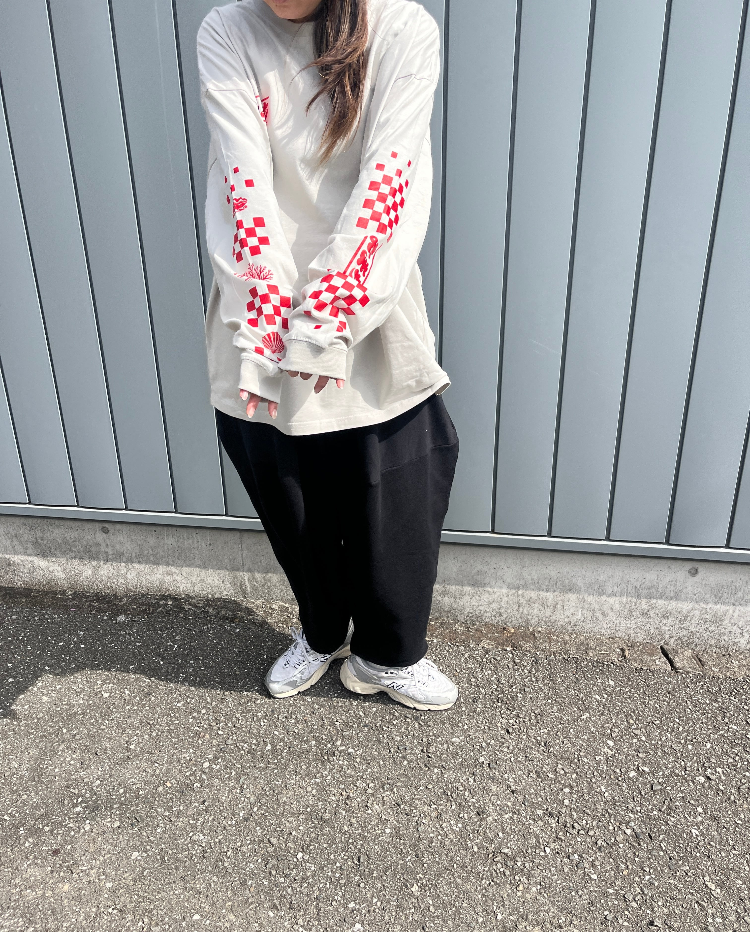 薄い合わせやすい色味のグレーのボディに赤色のプリントが鮮やかなストリートを意識したデザイン。